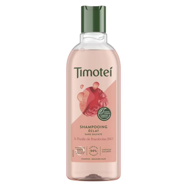 Découvrez le shampooing Timotei Éclat à l’huile de framboise bio pour cheveux colorésLe shampooing femme Timotei Éclat est idéal pour les cheveux colorés. Sa formule enrichie en huile de framboise bio et aux agents lavants d’origine végétale donne de l’éclat à vos cheveux et les nourrit intensément. Ce soin pour les cheveux est composé à 94 % d’ingrédients d’origine naturelle et est formulé sans silicone pour un volume naturel et sans sulfate pour laver en douceur.